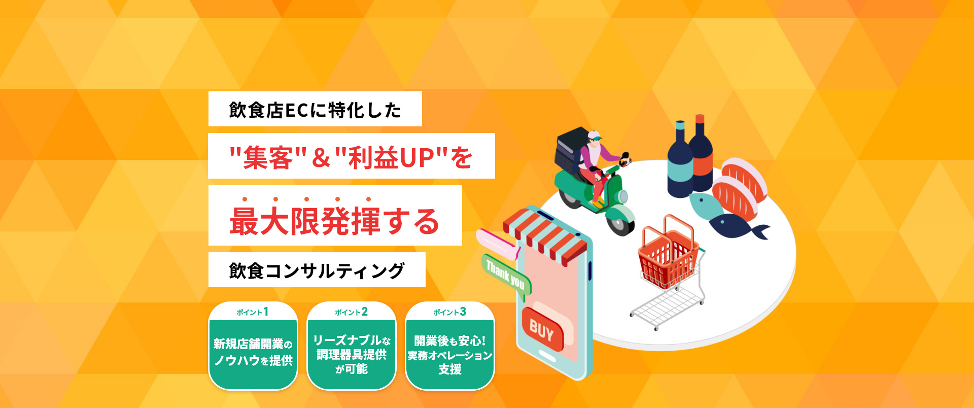 テイクアウト・デリバリー・EC販売の専用サイトの中から提供する商品内容に最適なリソースを選定し、サイト設計・制作を行います。また、集客コンサルをSNSやその他コンテンツのデジタルシステムを利用し効率的に集客をサポートします。